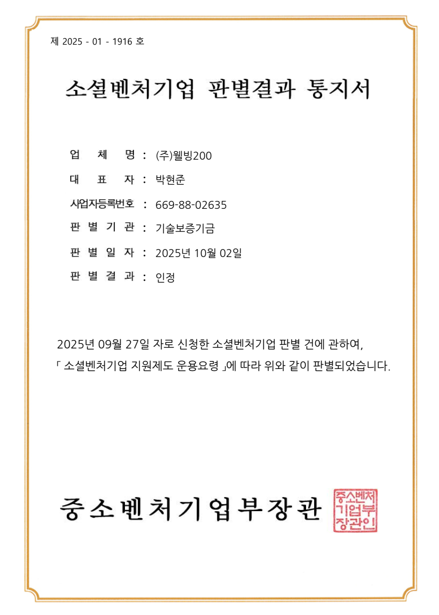 Wellbeing200 Co., Ltd. has been officially determined as a Social Venture Enterprise by the Ministry of Korea’s SMEs and Startups, and is pursuing both social value and economic value through innovation.